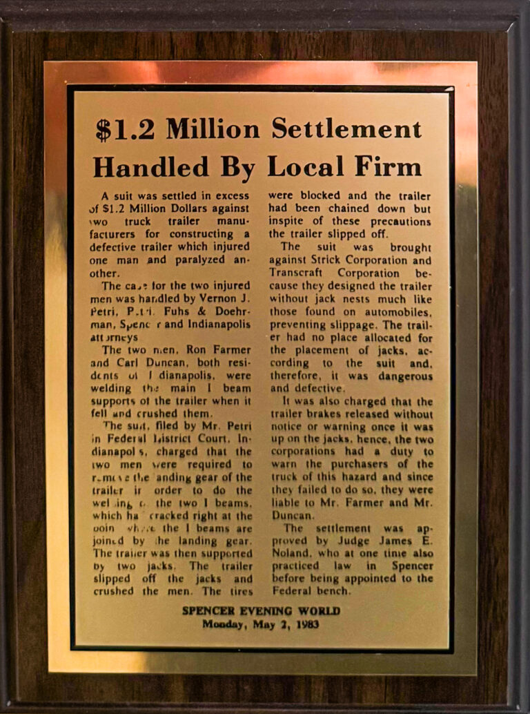 In 1983, Vernon J. Petri secured a $1.2 million settlement in a product liability case against two truck trailer manufacturers. The case involved a defectively constructed trailer that failed during operation, causing a serious accident that injured one man and left another paralyzed.